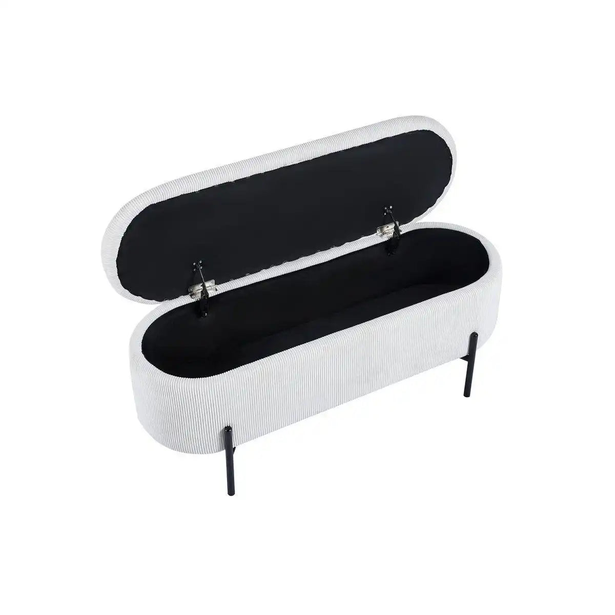 Wer skandinavisches Design mit praktischem Nutzen sucht, für den ist diese Bettbank mit angesagtem Cord Bezug die richtige Wahl. Der Polsterhocker punktet nicht nur mit topaktuellem Design, sondern bietet hinter dem klappbaren Deckel auch eine clevere Stauraumfunktion. Ob Decken, Bettbezug oder Kleidung – In der Bettbank können Sie auf stilvolle Weise Ordnung schaffen und Herumliegendes verstauen. Der weiche Cord-Stoff verleiht der Bettbank einen modernen Look und sorgt mit seinen charakteristischen Nähten für eine interessante Optik. Das Design-Gestell mit hohen Füßen besteht aus pulverbeschichtetem schwarzem Metall und rundet den Look ab. Frei im Raum stellbar, Sitzhöhe: 44 cm, mit aufklappbarem Element und Stauraum in Inneren, Bezug aus 88% Polyester/12% Nylon, max. Belastbarkeit: 120 KG, Beine schwarz Metall (Stahl) pulverbeschichtet, Lichtbeständigkeit Bezug: 4, Pilling Bezug: 5, Abnutzungsresistenz: 40.000.
