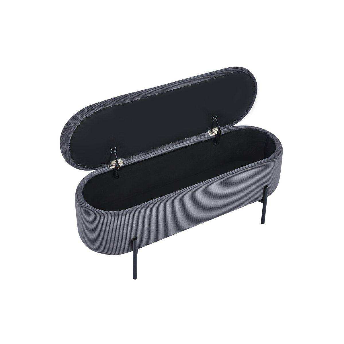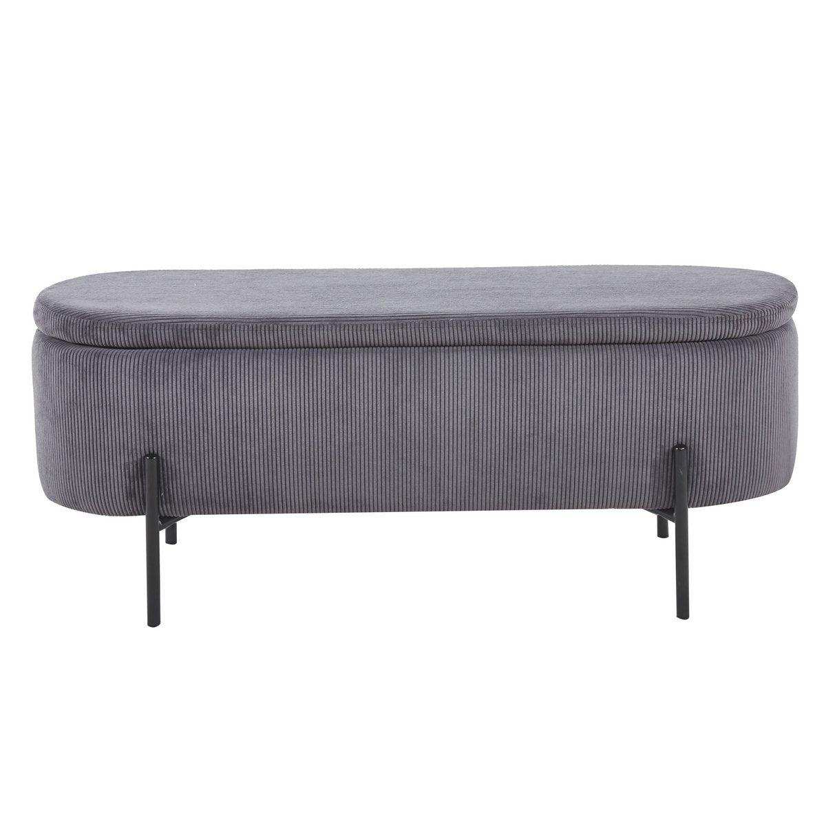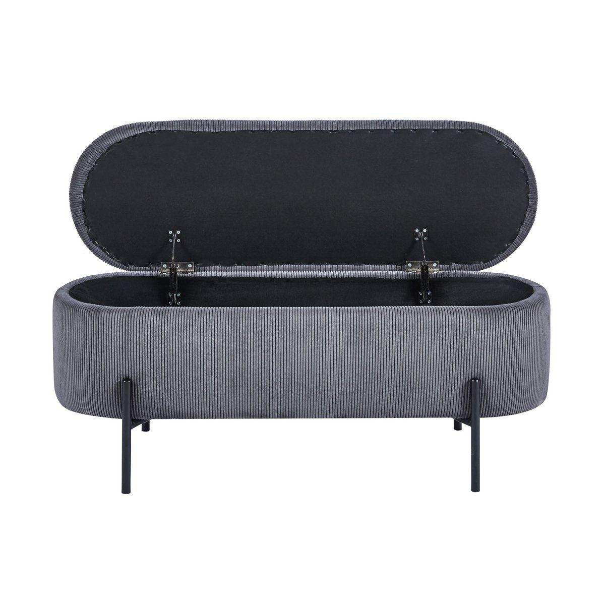 Wer skandinavisches Design mit praktischem Nutzen sucht, für den ist diese Bettbank mit angesagtem Cord Bezug die richtige Wahl. Der Polsterhocker punktet nicht nur mit topaktuellem Design, sondern bietet hinter dem klappbaren Deckel auch eine clevere Stauraumfunktion. Ob Decken, Bettbezug oder Kleidung – In der Bettbank können Sie auf stilvolle Weise Ordnung schaffen und Herumliegendes verstauen. Der weiche Cord-Stoff verleiht der Bettbank einen modernen Look und sorgt mit seinen charakteristischen Nähten für eine interessante Optik. Das Design-Gestell mit hohen Füßen besteht aus pulverbeschichtetem schwarzem Metall und rundet den Look ab. frei im Raum stellbar, Sitzhöhe: 44 cm, mit aufklappbarem Element und Stauraum in Inneren, Bezug aus 88% Polyester/12% Nylon, max. Belastbarkeit: 120 KG, Beine schwarz Metall (Stahl) pulverbeschichtet, Lichtbeständigkeit Bezug: 4, Pilling Bezug: 5, Abnutzungsresistenz: 40.000.