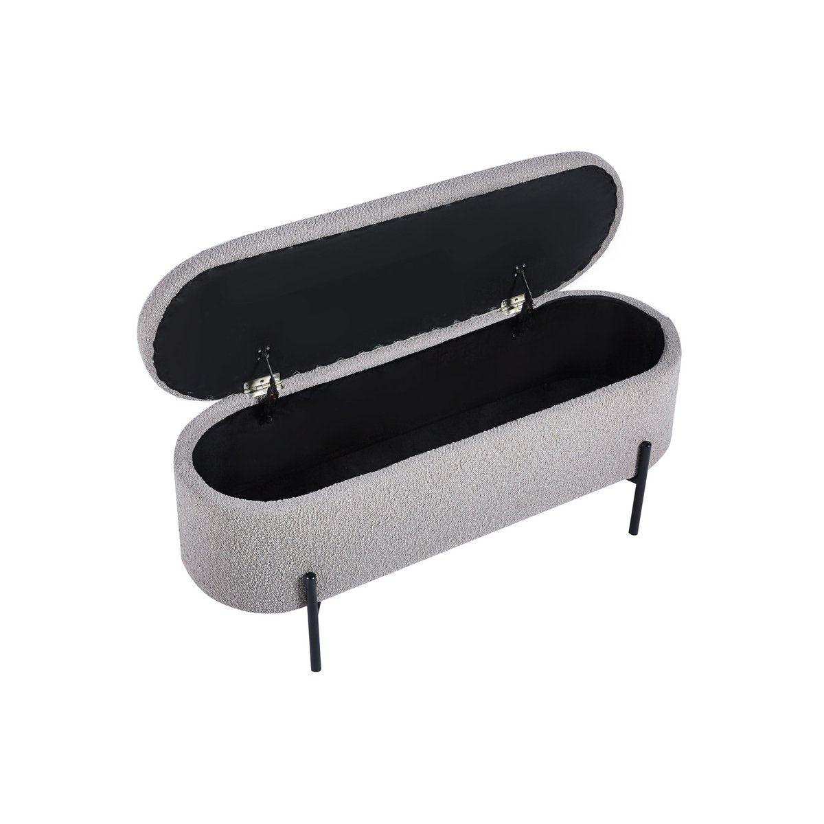 Wer skandinavisches Design mit praktischem Nutzen sucht, für den ist diese Bettbank mit angesagtem Bouclé Bezug die richtige Wahl. Der Polsterhocker punktet nicht nur mit topaktuellem Design, sondern bietet hinter dem klappbaren Deckel auch eine clevere Stauraumfunktion. Ob Decken, Bettbezug oder Kleidung – In der Bettbank können Sie auf stilvolle Weise Ordnung schaffen und Herumliegendes verstauen. Der Bouclé Stoff, der schon lange Einzug in unsere Wohn- und Schlafzimmer gehalten hat, vermittelt Wärme und Geborgenheit. Außerdem spiegelt der Stoff mit seiner wolligen Optik die Essenz des beliebten Scandi Styles gekonnt wider. Das Design-Gestell mit hohen Füßen besteht aus pulverbeschichtetem schwarzem Metall und rundet den Look ab. frei im Raum stellbar, Sitzhöhe: 44 cm, mit aufklappbarem Element und Stauraum in Inneren, Bezug: 100% Polyester, Lichtbeständigkeit Bezug: 4, Pilling Bezug: 5, Scheuertouren 100.000, max. Belastbarkeit: 120 KG, Beine schwarz Metall (Stahl) pulverbeschichtet.