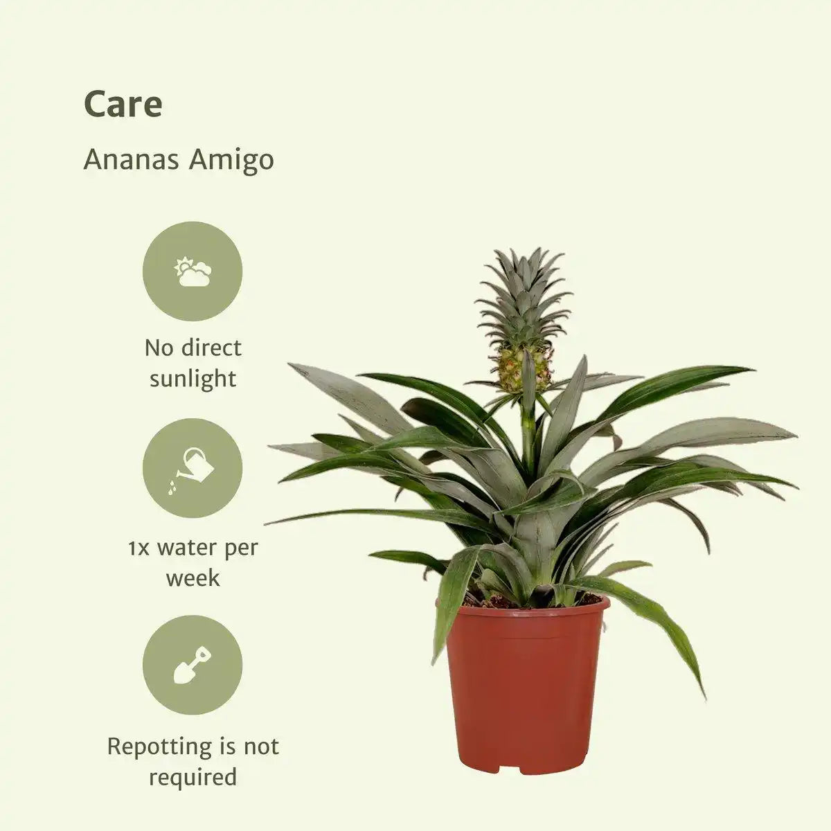 Die Bromelien-Ananas ist eine tropische Zimmerpflanze. Diese Zimmerpflanze stammt ursprünglich aus Brasilien, Bolivien und Paraguay. Der beste Standort für diese Zimmerpflanze mag Licht. Seien Sie vorsichtig bei viel direkter Sonneneinstrahlung. Am besten eignet sich für die Ananas Amigo ein Standort im Halbschatten. Gießen Sie die Zimmerpflanze einmal pro Woche im Herzen der Pflanze. Die Pflanze ist an hohe Luftfeuchtigkeit gewöhnt. Um die Luftfeuchtigkeit zu simulieren, können Sie die Pflanze wöchentlich mit einem Pflanzensprüher besprühen.