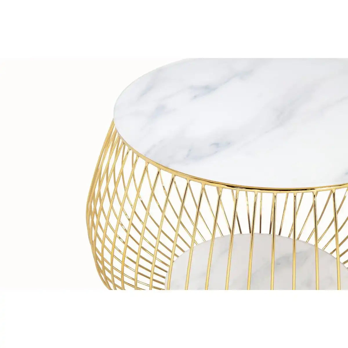 Der runde Couchtisch vereint modernes Design mit einer Portion Extravaganz. Die Kristallglasplatte mit Marmordruck passt perfekt zu dem goldfarbenen Gestell aus Metall. Der Sofatisch bietet genügend Ablagemöglichkeiten für z.B. Zeitschriften, Obst, Knabbereien oder eine Blumenvase. Durch sein attraktives Design und die runde Form ist dieser Couchtisch mit vielen Möbeln kombinierbar und findet auch in Ihrem Zuhause ein geeignetes Plätzchen. Die Oberfläche des Couchtisches ist sehr pflegeleicht und strapazierfähig. Kleinere Verschmutzungen können mit einem leicht feuchten Tuch entfernt werden. 6 mm starke Kristallglasplatte mit weißem Marmordruck, Gestell Ø10+05mm Metalldraht, Tischplatte Ø 60 cm.