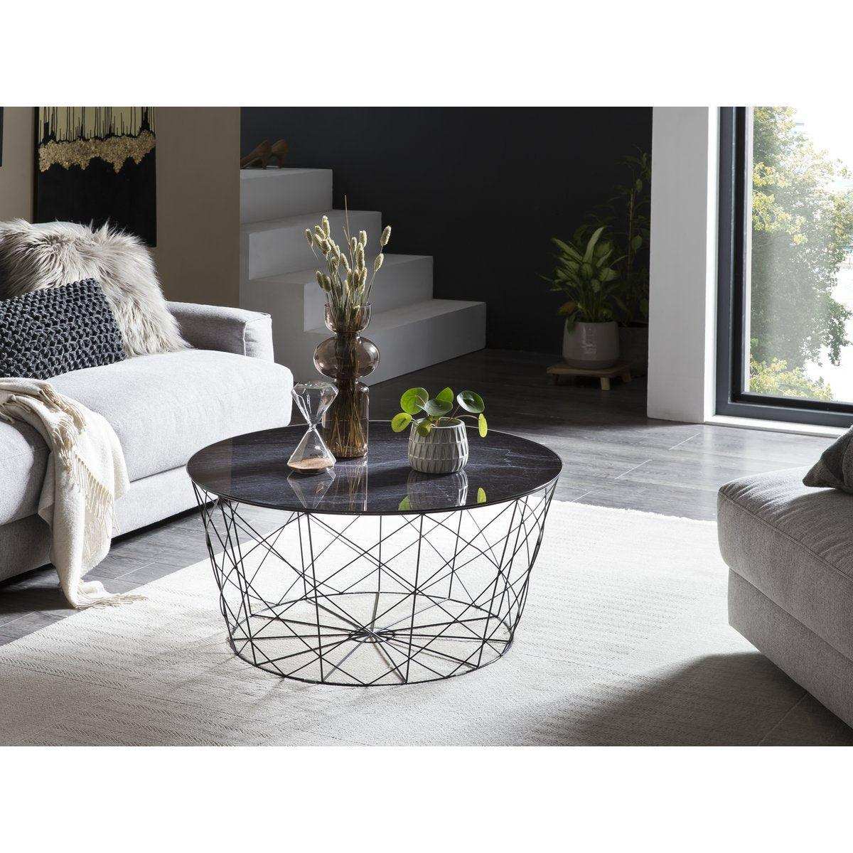 Der runde Couchtisch vereint modernes Design mit einer Portion Extravaganz. Die Glasplatte mit unterliegender Folie in Marmoroptik passt perfekt zu dem Metallgestell in Schwarz. Der Sofatisch bietet genügend Ablagemöglichkeiten für z.B. Obst, Knabbereien oder eine Blumenvase. Das Gestell kann als Aufbewahrungskorb für Zeitschriften genutzt werden. Durch sein attraktives Design ist dieser Couchtisch mit vielen Möbeln kombinierbar und findet auch in Ihrem Zuhause ein geeignetes Plätzchen. 6 mm starke Glasplatte mit unterliegender Folie in Marmoroptik Schwarz, Gestell nutzbar als Aufbewahrungskorb.