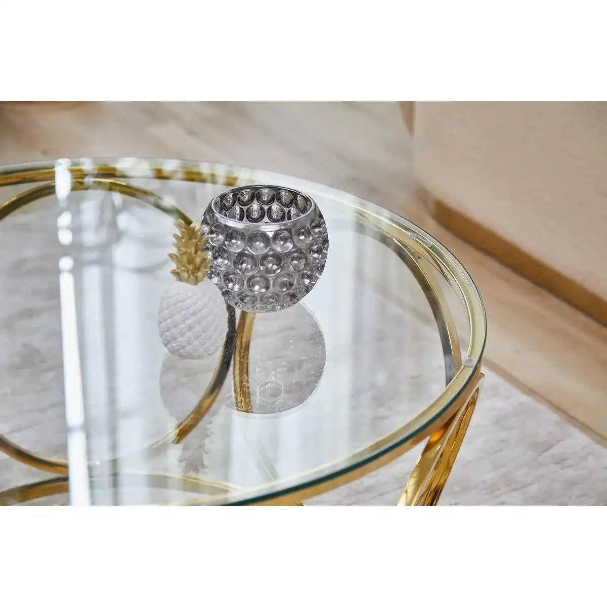 Dieser elegante Couchtisch versprüht Glamour pur im Wohnbereich. Der Hingucker des Tisches ist das extravagante Design-Gestell aus langlebigem Stainless Steel in goldfarbenem Finish. Das Gerüst aus runden Metallornamenten macht optisch richtig etwas her und wird zum edlen Mittelpunkt im Wohnzimmer. Passend zu allen Farben und Formen von Polstermöbeln, fügt sich der Couchtisch in Gold und klarem Glas harmonisch in viele Wohnstile ein. Dank der 8 mm Platte aus Sicherheitsglas hat der Tisch eine hohe Stoßfestigkeit und bietet Bruchsicherheit. Dier Oberfläche von Glasplatte und Gestell sind zusätzlich besonders pflegeleicht und lassen sich einfach feucht abwischen. Mit diesem Couchtisch zieht ein Stück Extravaganz in Ihre vier Wände ein. Plattenstärke 8 mm, Platte aus Sicherheitsglas, Gestell aus rostfreiem Edelstahl/Stainless Steel in goldenem Finish, max. Belastbarkeit ca. 50 KG.