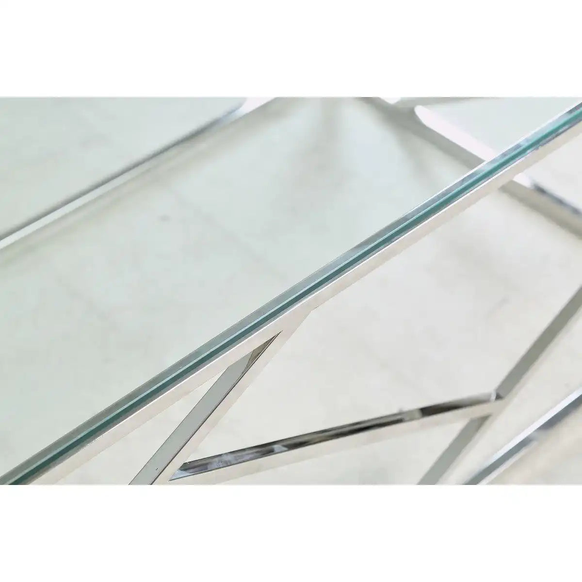 Wer ein extravagantes Design-Highlight abseits der Norm sucht, der trifft mit diesem Couchtisch aus Sicherheitsglas und robustem Edelstahl garantiert die richtige Wahl. Das abstrakte Edelstahl-Gestell macht den Glastisch zu etwas ganz Besonderem und wertet jedes Wohn- und Interieur im Handumdrehen luxuriös auf. Die Plattengröße von 120x60 cm bietet Ablagefläche für Alltagsgegenstände und Platz für Dekoelemente. Die Tischplatte besteht aus 8 mm starkem Sicherheitsglas und ergibt in Kombination mit dem Gestell aus rostfreiem Stahl eine besonders pflegeleichte und langlebige Kombination. Das schöne Gestell in Silber wird in jedem Fall zum aufregenden Hingucker als Glanzstück vor dem Sofa. Tischplatte aus klarem Sicherheitsglas, verchromtes Gestell aus rostfreiem Edelstahl, Plattenstärke 8 mm.