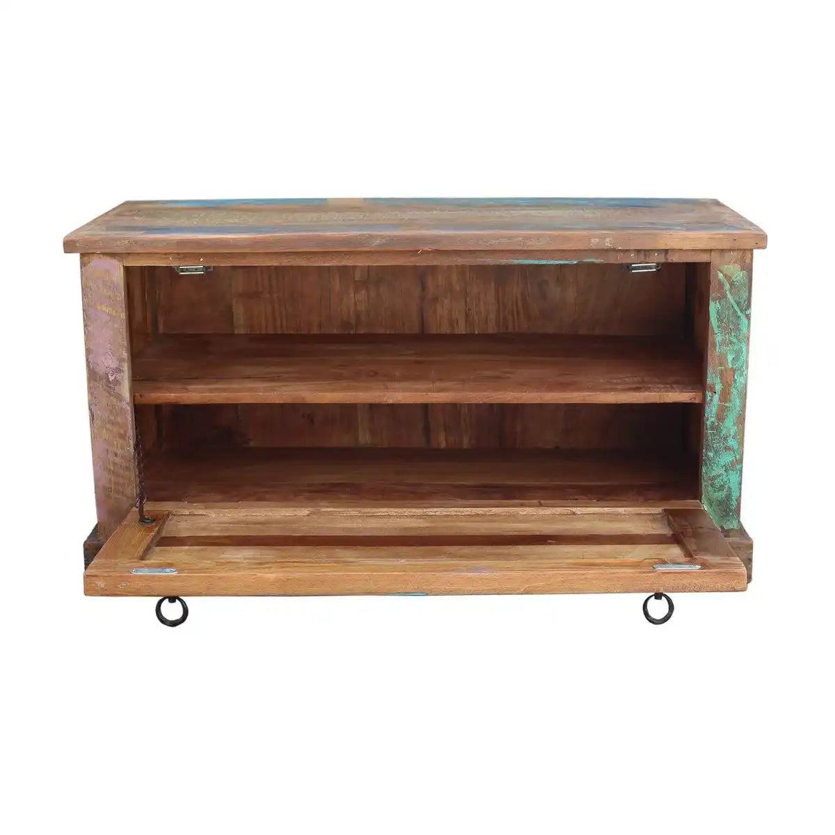 „Aus Alt mach Neu“, nach dieser einfachen Grundregel werden aus alten ausrangierten Fischerbooten von Hand gefertigte Einzelmöbel, die mit Beschlägen aus Altmetall zusätzlich aufgepeppt werden. Dieses bunt lackierte Dielen-Set ist mit seinen gewollten Gebrauchsspuren und der Lackierung im Shabby Chic eine Augenweide. Ein niedriger Schuhschrank bietet Platz für ca. 8 Paar Schuhe und ist auch kurzfristig als Bank einsetzbar, um das Schuhe anziehen zu erleichter. Der Kleiderschrank kann wahlweise mit 3 Einlegeböden oder 1 Einlegeboden und 1 Kleiderstange genutzt werden, die 2 Garderobenpaneele bieten zusätzlichen Platz für Jacken. Bei diesem Dielen-Set ist jedes Stück ein Unikat. Mit der Kombination aus Shabby Chic und Factory Style holen Sie sich ein originelles Design in den Flur und setzen ein stylisches Statement schon im Eingangsbereich. Schuhschrank 130x40x50 cm für ca. 8 Paar Schuhe, Garderobenpaneel 35x8x110 cm, 4 Haken, Kleiderschrank 80x45x180 cm, innen 3 Böden, 2 davon herausnehmbar, 1 herausnehmbare Kleiderstange.