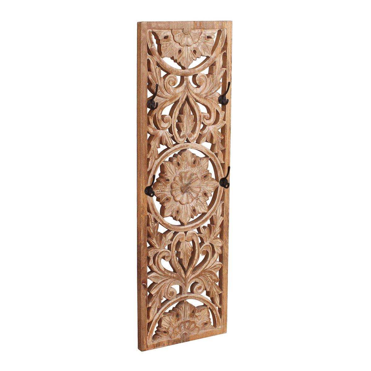 Holen Sie sich nicht nur Ordnung in den Eingangsbereich, sondern auch einen Hauch Exotik. Das Garderoben-Set, bestehend aus einem Schuhschrank, 2 praktischen Garderobenpaneelen mit je 4 Doppelhaken und einem Garderobenschrank, den Sie wahlweise mit 3 Einlegeböden oder einem Boden und einer Kleiderstange nutzen können, überzeugt mit Charakter und Einzigartigkeit. Angefertigt aus Mangoholz in einem warmen Naturton und mit aufwändigen Schnitzereien verziert, lädt der Stil zum Träumen ein. Dieses Dielen-Set kombiniert mit einem modernen Ambiente bietet einen zusätzlichen Blickfang. Schuhschrank 80x40x50 cm für ca. 6 Paar Schuhe, Garderobenpaneel 35x8x99 cm, 4 Haken, Kleiderschrank 90x45x185 cm, innen 3 Böden, 2 davon herausnehmbar, 1 herausnehmbare Kleiderstange.