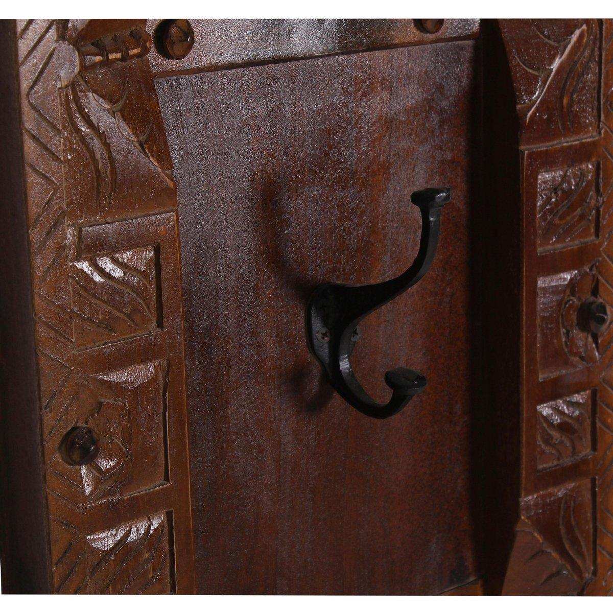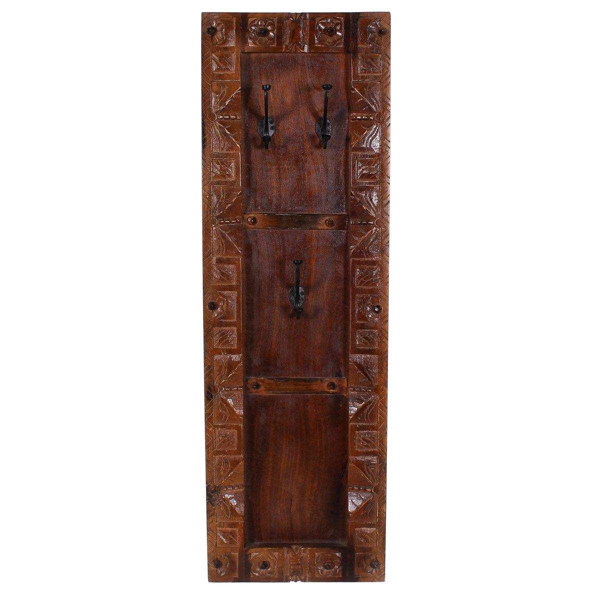 Aufwändige Schnitzereien auf recyceltem Altholz mit Metallapplikationen geben der Front dieses Dielen-Sets den für Indien typisch antik kolonialen Look. Der Schuhschrank bietet Platz für ca. 6 Paar Schuhe und kann gleichzeitig vorübergehend als Sitzbank beim Anziehen der Schuhe genutzt werden. 2 Garderobenpaneele mit je 4 Doppelhaken für Ihre Jacken runden das Set ab. Mit diesem Dielen-Set holen Sie sich ein rustikales und gleichzeitig edles Design in den Flur und setzen ein stylisches Statement schon im Eingangsbereich. Schuhschrank 85x40x45 cm für ca. 6 Paar Schuhe, Garderobenpaneel 35x8x110 cm, 4 Haken.