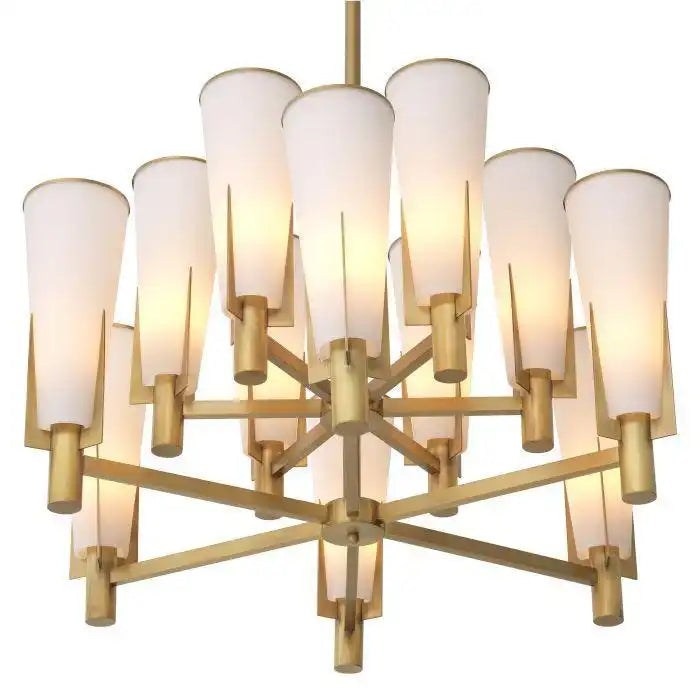Chandelier Dino ist außergewöhnlich gut verarbeitet und spricht sowohl den klassischen als auch den modernen Geschmack an. Sein reiches antikes Messing-Finish ist gepaart mit einem kühnen geometrischen Design, das an die Retro-Ästhetik der 1950er und 1960er Jahre erinnert.