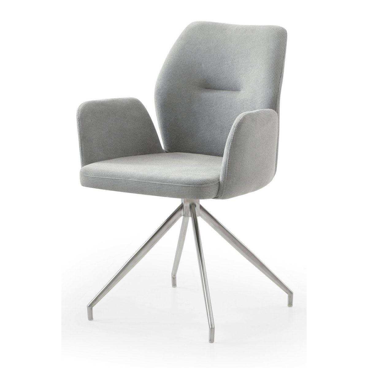 Der optimale Platz für gesellige Runden bietet diese 5-teilige Essgruppe, bestehend aus einem Esstisch aus Massivholz und 4 Armlehnstühlen mit zeitlosem Strukturstoff-Bezug. Die 26 mm dicke Tischplatte besteht aus Akazienholz und wurde aus echter Baumkante gefertigt. Das U-Gestell aus schwarz lackiertem Metall verleiht dem Tisch eine sehr gute Stabilität und ist das passende Gegenstück zur schönen Tischplatte in der Farbe Cognac. Besticht durch moderne Optik und die hohe Verarbeitungsqualität: Im modernen Design fügt sich der Armlehnstuhl mit 180° Drehfunktion in Ihr Zuhause ein. Der Polsterstuhl besticht durch seine trendige Formensprache mit ergonomisch geformter Rückenlehne mit Ziernaht, gerader Sitzfläche und leicht ausgestellten Armlehnen. Bezogen ist das Sitzmöbel mit einem edlen Strukturstoff, der über strapazierfähige Eigenschaften verfügt und in vielen attraktiven Unifarben zur Auswahl steht. Ein weiteres Highlight stellt das filigran wirkende Design-Gestell aus rostfreiem Edelstahl dar. Durch den integrierten Drehmechanismus ermöglicht der Sessel ein dynamisches Sitzen. Hinweis: Da es sich bei diesem Massivholztisch um ein Naturprodukt handelt, kann es zu Astlöchern oder unterschiedlichen Farbschmückungen kommen, welche jedoch keine Fehler darstellen, sondern den individuellen Charakter des Echtholzes unterstreichen. Maße des Tischs: B160xT85xH77 cm, Plattenstärke 26 mm, mit echter Baumkante, Maße des Stuhls: B60xT62xH89 cm, Sitzhöhe: 45 cm, Sitzbreite: 46 cm, Sitztiefe: 47 cm, Höhe der Armlehnen: 68 cm, Höhe der Rückenlehne: 49 cm, Gestell aus rostfreiem Edelstahl, ergonomisch geformte Rücken- und Armlehnen, Bezugsmaterial: Stoffbezug, 100% PES, Rundumbezug: Mit Rundumbezug, Scheuerbeständigkeit: 50.000 Scheuertouren, Pillingbildung: 5 = keine Pillingbildung, Lichtbeständigkeit: 4 = ziemlich.