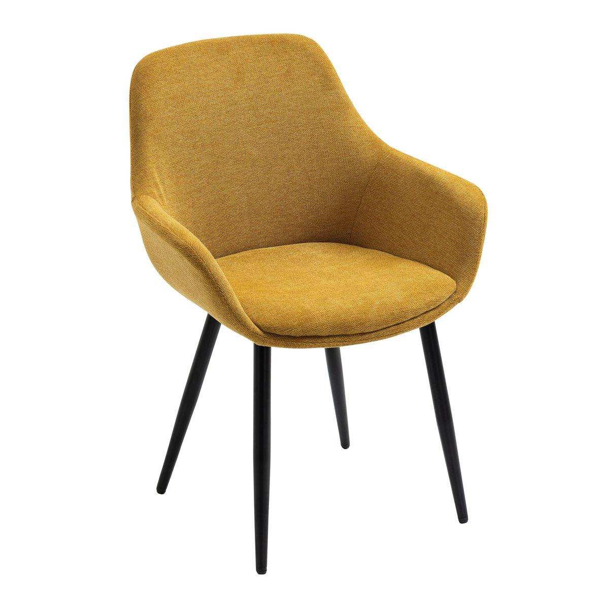 Der optimale Platz für gesellige Runden bietet diese 5-teilige Essgruppe, bestehend aus einem Esstisch aus Massivholz und 4 Armlehnstühlen mit zeitlosem Strukturstoff-Bezug. Die 26 mm dicke Tischplatte besteht aus Akazienholz und wurde aus echter Baumkante gefertigt. Das U-Gestell aus schwarz lackiertem Metall verleiht dem Tisch eine sehr gute Stabilität und ist das passende Gegenstück zur schönen Tischplatte in der Farbe Cognac. Die passenden Stühle dazu zeigen, dass Eleganz und Komfort sich nicht immer unterscheiden müssen. Die Sitzfläche, die Rückenlehne und die Armlehnen sind mit einem Strukturstoff wunderbar gemütlich gepolstert. Der Stuhl hat mit seinen mattschwarzen Beinen aus pulverbeschichtetem Metall einen festen Stand und bildet ein harmonisches Gesamtbild. Hinweis: Da es sich bei diesem Massivholztisch um ein Naturprodukt handelt, kann es zu Astlöchern oder unterschiedlichen Farbschmückungen kommen, die jedoch keinen Fehler darstellen, sondern den individuellen Charakter des Echtholzes unterstreichen. Maße des Tischs: B160xT85xH77 cm, Plattenstärke 26 mm, mit echter Baumkante, Maße des Stuhls: B64xT59x86 cm, Sitzhöhe: ca. 47 cm, Sitztiefe: ca. 44 cm, Sitzbreite: ca. 44 cm, Höhe der Armlehnen: ca. 61 cm, Höhe der Rückenlehne: ca. 40 cm, max. Belastbarkeit ca. 110 KG.