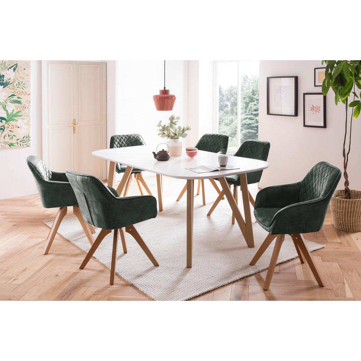 Die 5-tlg. Essgruppe besteht aus einem Esstisch in der Farbe matt-weiß mit Massivholzgestell und 4 Esszimmerstühlen. An dieser 5-tlg. Tischgruppe bietet sich genügend Platz für Ihre Gäste. Die edlen Armlehnstühle besitzen einen hochwertigen Bezug aus Samtvelours, sowie Stuhlbeine aus massivem Buchenholz. Die 180° Drehplatte unter der Sitzfläche sorgt für optimalen Bewegungsfreiraum und Sitzkomfort. Die sesselförmigen Sitze mit Armlehnen runden den Komfort perfekt ab. Das Stuhlmodell in ausgefallenem Retro-Design punktet nicht nur durch sein auffälliges Aussehen, sondern auch mit Qualität und Strapazierfähigkeit. Einen besonderen Akzent verleiht dem Esstisch seine moderne Optik. In Kombination mit den farblich abgesetzten Tischbeinen und der weißen Tischplatte, die aus besonders pflegeleichtem MDF besteht, ist der Tisch ein optisches Highlight in Ihrem Esszimmer. Durch seine zeitlose Optik lässt sich das Set optimal mit weiteren Möbelstücken und Einrichtungsstilen kombinieren. Maße Esstisch: B160xT90xH76 cm, Abstand zwischen den Tischbeinen: ca. 144 cm, Maße Stuhl: B59xT61xH85 cm, Sitzhöhe: ca. 51 cm, Sitztiefe: ca. 43 cm, mit 180° Drehplatte unter der Sitzfläche.