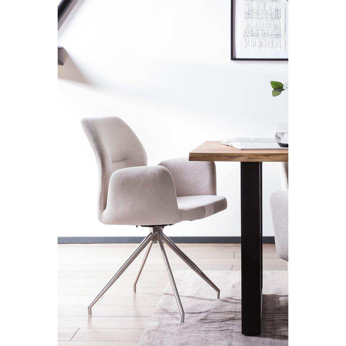Diese 5-teilige Essgruppe mit modernem Charme ist die richtige Lösung für alle, die mehr als nur einen Platz zum Essen suchen. Die 26 mm starke Tischplatte aus massiver Akazie wird mit OSMO Hartwachs-Möbelöl in seidenmattem Finish behandelt, so dass der Tisch vor Wasser, Schmutz und Abrieb geschützt ist. Besonderes Highlight: Das U-Gestell aus schwarz lackiertem Metall verleiht dem Tisch eine sehr gute Stabilität und ist das passende Gegenstück zur Tischplatte in warmem Walnusston. Mit diesem Esstisch mit echter Baumkante holen Sie sich ein Stück Natur in die eigenen vier Wände. Im modernen Design fügen sich die Armlehnstühle mit 180° Drehfunktion in Ihr Zuhause ein. Der Polsterstuhl besticht durch seine trendige Formensprache mit ergonomisch geformter Rückenlehne mit Ziernaht, gerader Sitzfläche und leicht ausgestellten Armlehnen. Bezogen ist das Sitzmöbel mit einem edlen Strukturstoff, der über strapazierfähige Eigenschaften verfügt und in vielen attraktiven Unifarben zur Auswahl steht. Ein weiteres Highlight stellt das filigran wirkende Design-Gestell aus rostfreiem Edelstahl dar. Durch den integrierten Drehmechanismus ermöglicht der Sessel ein dynamisches Sitzen. Achtung: Da es sich bei diesem Massivholztisch um ein Naturprodukt handelt, kann es zu Astlöchern oder unterschiedlichen Farbschmückungen kommen, welche jedoch keine Fehler darstellen, sondern den individuellen Charakter des Echtholzes unterstreichen. Maße des Tischs: B160xT90xH75, Plattenstärke: 26 mm, Tischplatte mit Osmo Hartwachs-Öl Nussbaumfarbig behandelt in seidenmattem Finish, schützt vor Wasser, Schmutz und Abrieb, Gestell schwarz lackiert, Maße des Gestells: ca. 4x8 cm, Maße des Stuhls: B60xT62xH89 cm, Sitzhöhe: 45 cm, Sitzbreite: 46 cm, Sitztiefe: 47 cm, Höhe der Armlehnen: 68 cm, Höhe der Rückenlehne: 49 cm, Gestell aus rostfreiem Edelstahl, ergonomisch geformte Rücken- und Armlehnen, Bezugsmaterial: Stoffbezug, 100% PES, Rundumbezug: Mit Rundumbezug, Scheuerbeständigkeit: 50.000 Scheuertouren, Pillingbildung: 5 = keine Pillingbildung, Lichtbeständigkeit: 4 = ziemlich
