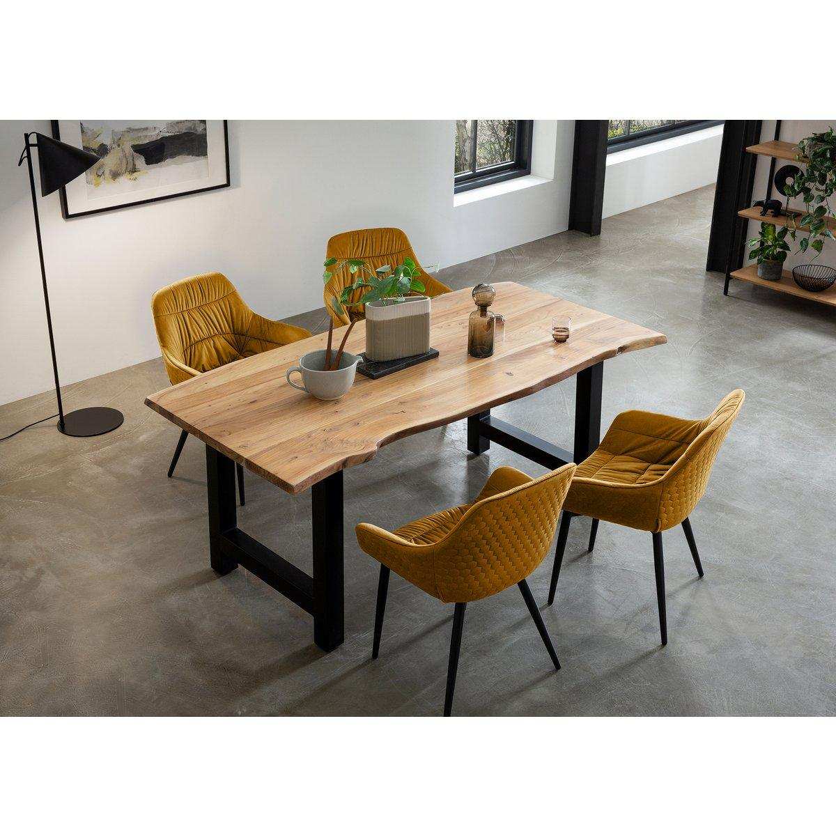 Natürlicher Look, gepaart mit glamouröser Eleganz. Diese 5-tlg. Die Essgruppe besteht aus einem Esstisch mit 35 mm starker Tischplatte aus massivem Akazienholz und 4 Armlehnstühlen mit edel schimmerndem Samtbezug. Die Platte des Esstischs ist zweifach gewachst, was das Holz besonders unempfindlich und feuchtigkeitsabweisend macht. Die Kanten mit natürlichem Formverlauf verleihen der Platte dabei einen natürlichen Charme. Besonderer Hingucker ist das stabile H-Gestell aus 75x75 mm Metallrohren. Das chice Pendant zum Esstisch sind die Armlehnstühle in Samt-Optik mit Quersteppung innen und Wabensteppung außen. Das 4-Fuß-Gestell aus schwarzem Metall sorgt für Stabilität. Hinweis: Da es sich bei diesem Massivholztisch um ein Naturprodukt handelt, kann es zu Astlöchern oder unterschiedlichen Farbschmückungen kommen, die jedoch keinen Fehler darstellen, sondern den individuellen Charakter des Echtholzes unterstreichen. Auch die Tiefe kann aufgrund der natürlichen Formgebung variieren. Alle diese Unterschiede machen diesen Esszimmertisch zu einem echten Unikat. Maße des Tischs: B180xT90xH76,5 cm, Maße des Stuhls: B63xT61xH81,5 cm, Sitz- und Rückenlehne innen mit Quersteppung, Wabensteppung außen, max. Belastbarkeit ca. 110 KG, Sitzhöhe: ca. 46 cm, Sitztiefe: ca. 41 cm, Sitzbreite: ca. 41 cm, Höhe der Armlehnen: ca. 61 cm, Massivholz geölt und zweifach gewachst, Oberfläche unempfindlich und feuchtigkeitsabweisend, Kanten mit natürlicher Formgebung, Plattenstärke 35 mm, Rohrstärke 75x75 mm, Abstand zwischen den Tischbeinen: ca. 120 cm.
