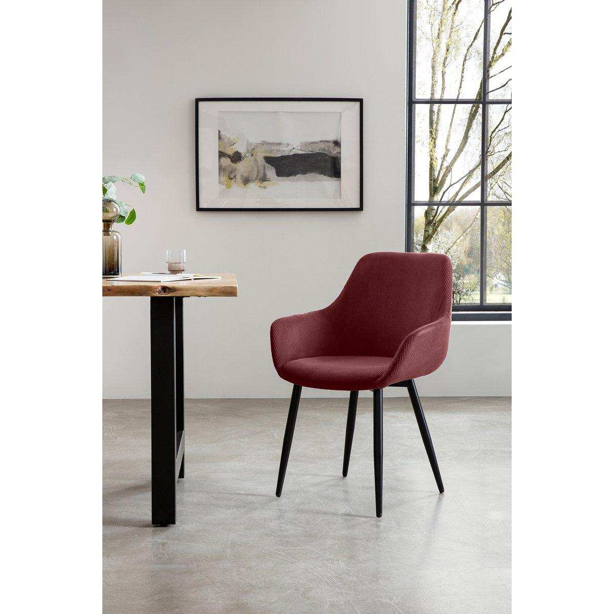 Zeitlos schön mit modernem Flair ist diese 5-teilige Essgruppe, bestehend aus einem Esstisch mit 35mm starker Tischplatte aus massivem Akazienholz und 4 Armlehnstühlen in hochwertiger Cord-Optik. Die Platte des Esstischs ist zweifach gewachst, was das Holz besonders unempfindlich und feuchtigkeitsabweisend macht. Die Kanten mit natürlichem Formverlauf verleihen der Platte dabei einen natürlichen Charme. Besonderer Hingucker ist das stabile H-Gestell aus 75x75 mm Metallrohren. Passend zum Esstisch sind in dieser Speisegruppe 4 Armlehnstühle mit Cord-Bezug enthalten. Die ausgestellten Armlehnen sorgen für optimalen Sitzkomfort und das robuste 4-Fuß-Gestell aus pulverbeschichtetem Metall für einen wackelfreien Stand. Hinweis: Da es sich bei diesem Massivholztisch um ein Naturprodukt handelt, kann es zu Astlöchern oder unterschiedlichen Farbschmückungen kommen, welche jedoch keine Fehler darstellen, sondern den individuellen Charakter des Echtholzes unterstreichen. Auch die Tiefe kann aufgrund der natürlichen Formgebung variieren. Alle diese Unterschiede machen diesen Esszimmertisch zu einem echten Unikat. Maße des Tischs: B180xT90xH76,5 cm, Maße des Stuhls: B64xT59xH86 cm, Sitzhöhe: 47 cm, Sitzbreite: 44 cm, Sitztiefe 44 cm, Höhe der Armlehnen: 61 cm, Bezug: 80% Polyester, 20% Nylon, Lichtbeständigkeit Bezug: 4, Pilling Bezug: 4,5, Scheuertouren 40.000, Massivholz geölt und zweifach gewachst, Oberfläche unempfindlich und feuchtigkeitsabweisend, Kanten mit natürlicher Formgebung, Plattenstärke 35 mm, Rohrstärke 75x75 mm, Abstand zwischen den Tischbeinen: ca. 120 cm.