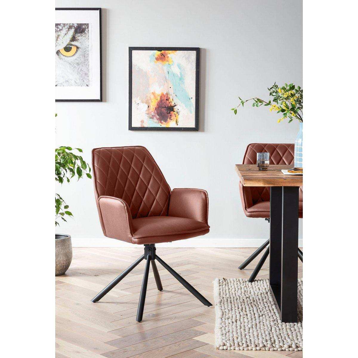 Diese 5-teilige Essgruppe mit modernem Charme ist die richtige Lösung für alle, die mehr als nur einen Platz zum Essen suchen. Die 26 mm starke Tischplatte aus massiver Akazie wird mit OSMO Hartwachs-Möbelöl in seidenmattem Finish behandelt, so dass der Tisch vor Wasser, Schmutz und Abrieb geschützt ist. Besonderes Highlight: Das U-Gestell aus schwarz lackiertem Metall verleiht dem Tisch eine sehr gute Stabilität und ist das passende Gegenstück zur Tischplatte in warmem Walnusston. Mit diesem Esstisch mit echter Baumkante holen Sie sich ein Stück Natur in die eigenen vier Wände. Die Armlehnstühle überzeugen durch die funktionale 360 Grad Drehfunktion. Der Microfaser-Bezug in Kunstlederoptik sieht sehr edel aus und passt perfekt zu den schwarzen Beinen. Das 4-beinige Metallgestell gewährleistet einen sicheren und stabilen Stand. Der Polsterstuhl bietet durch seine sesselartige Sitzfläche einen Sitzkomfort der Extraklasse. Die Rautensteppung auf der Rückenlehne ist eine Augenweide und macht dieses Möbel zum absoluten Blickfang in Ihrem Wohnraum. Achtung: Da es sich bei diesem Massivholztisch um ein Naturprodukt handelt, kann es zu Astlöchern oder unterschiedlichen Farbschmückungen kommen, welche jedoch keine Fehler darstellen, sondern den individuellen Charakter des Echtholzes unterstreichen. Maße des Tischs: B180xT90xH75 cm, Plattenstärke: 26 mm, Tischplatte mit Osmo Hartwachs-Öl Nussbaumfarbig behandelt in seidenmattem Finish, schützt vor Wasser, Schmutz und Abrieb, Gestell schwarz lackiert, Maße des Gestells: ca. 4x8 cm.