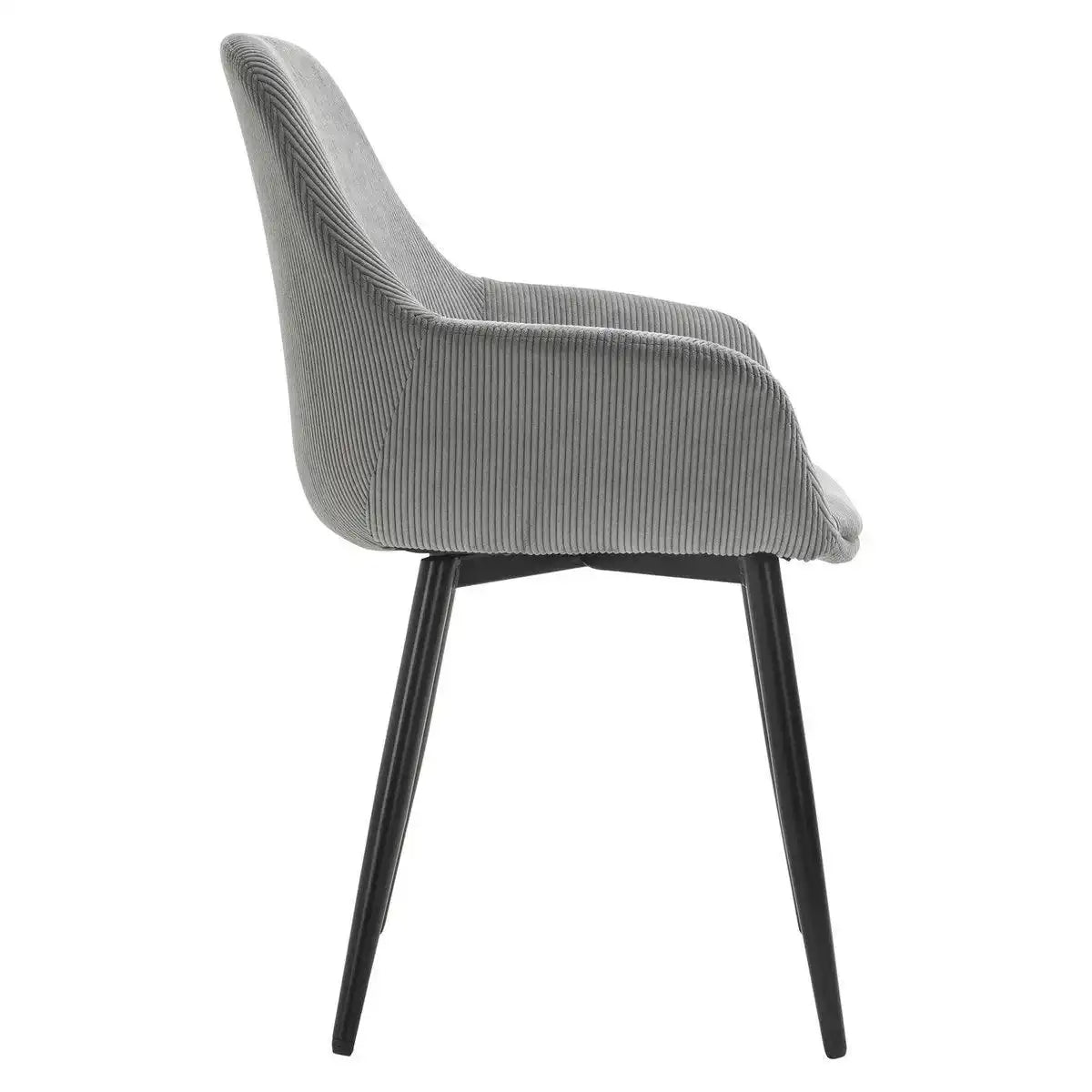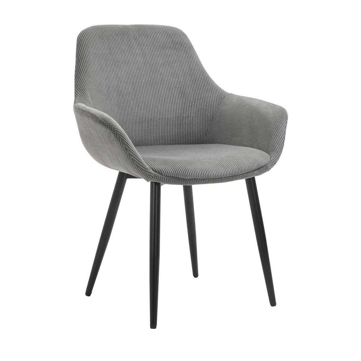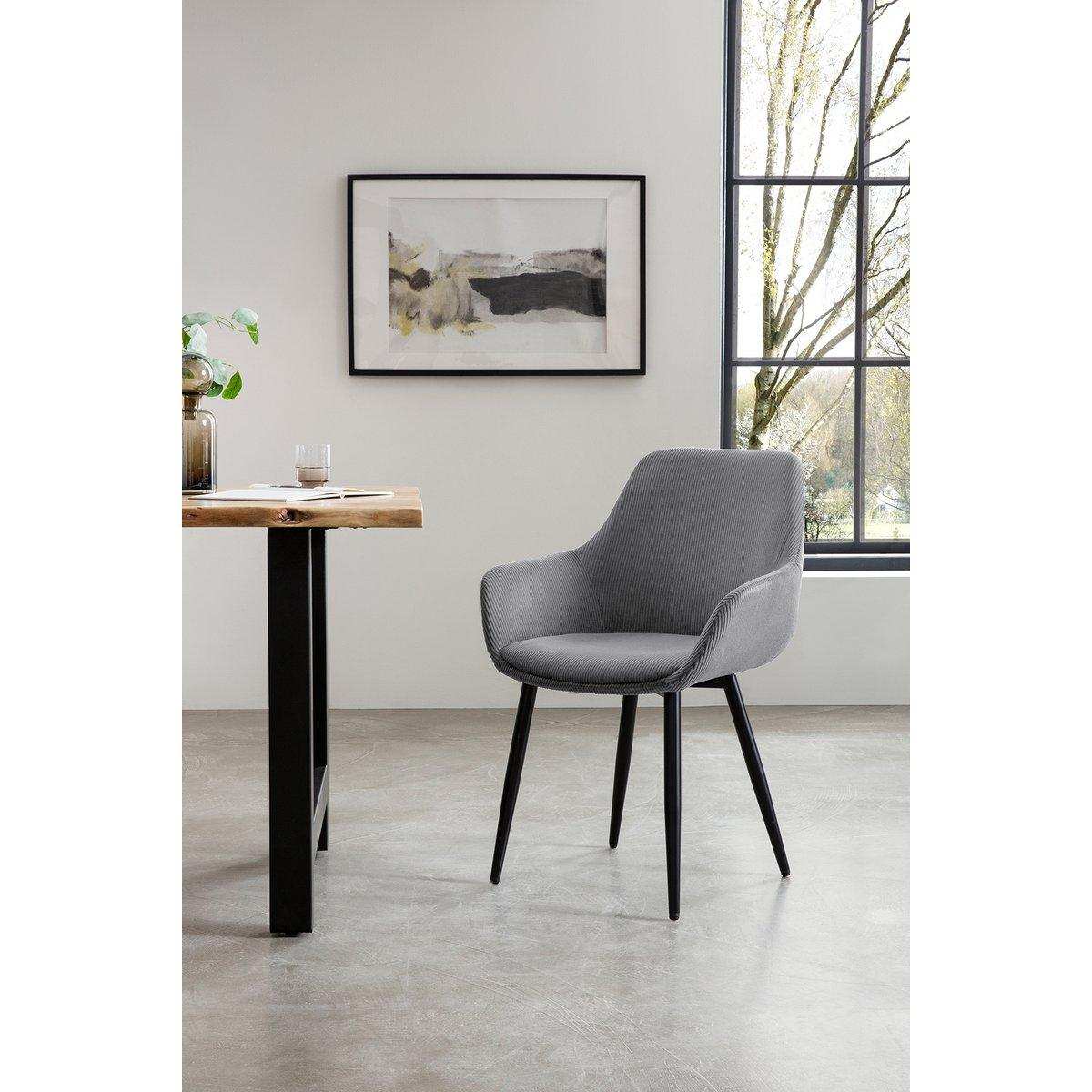 Zeitlos schön mit modernem Flair ist diese 5-teilige Essgruppe, bestehend aus einem Esstisch mit 35mm starker Tischplatte aus massivem Akazienholz und 4 Armlehnstühlen in hochwertiger Cord-Optik. Die Platte des Esstischs ist zweifach gewachst, was das Holz besonders unempfindlich und feuchtigkeitsabweisend macht. Die Kanten mit natürlichem Formverlauf verleihen der Platte dabei einen natürlichen Charme. Besonderer Hingucker ist das stabile H-Gestell aus 75x75 mm Metallrohren. Passend zum Esstisch sind in dieser Speisegruppe 4 Armlehnstühle mit Cord-Bezug enthalten. Die ausgestellten Armlehnen sorgen für optimalen Sitzkomfort und das robuste 4-Fuß-Gestell aus pulverbeschichtetem Metall für einen wackelfreien Stand. Hinweis: Da es sich bei diesem Massivholztisch um ein Naturprodukt handelt, kann es zu Astlöchern oder unterschiedlichen Farbschmückungen kommen, die jedoch keinen Fehler darstellen, sondern den individuellen Charakter des Echtholzes unterstreichen. Auch die Tiefe kann aufgrund der natürlichen Formgebung variieren. Alle diese Unterschiede machen diesen Esszimmertisch zu einem echten Unikat. Maße des Tischs: B180xT90xH76,5 cm, Maße des Stuhls: B64xT59xH86 cm, Sitzhöhe: 47 cm, Sitzbreite: 44 cm, Sitztiefe 44 cm, Höhe der Armlehnen: 61 cm, Bezug: 80 % Polyester, 20 % Nylon, Lichtbeständigkeit Bezug: 4, Pilling Bezug: 4,5, Scheuertouren 40.000, Massivholz geölt und zweifach gewachst, Oberfläche unempfindlich und feuchtigkeitsabweisend, Kanten mit natürlicher Formgebung, Plattenstärke 35 mm, Rohrstärke 75x75 mm, Abstand zwischen den Tischbeinen: ca. 120 cm.