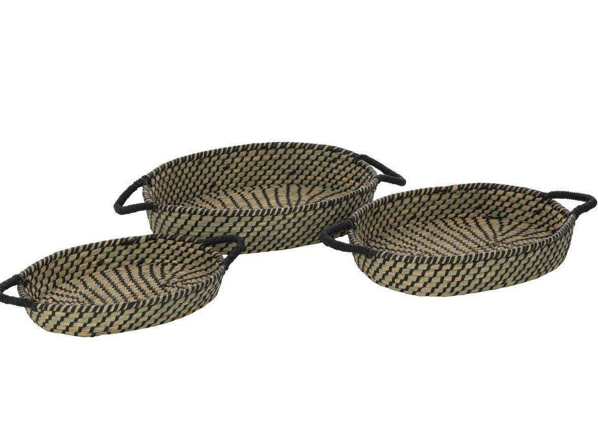 Bringen Sie mit diesem eleganten 3er-Set Körbe mit ovalen Griffen aus Stroh in Natur und Schwarz stilvolle Ordnung in Ihr Zuhause. Die hochwertigen Materialien und langlebige Konstruktion bieten eine perfekte Lösung für die Aufbewahrung von Spielzeug, Kleidung, Büchern und mehr. Ein praktisches und ästhetisches Must-Have für jedes anspruchsvolle Interieur.