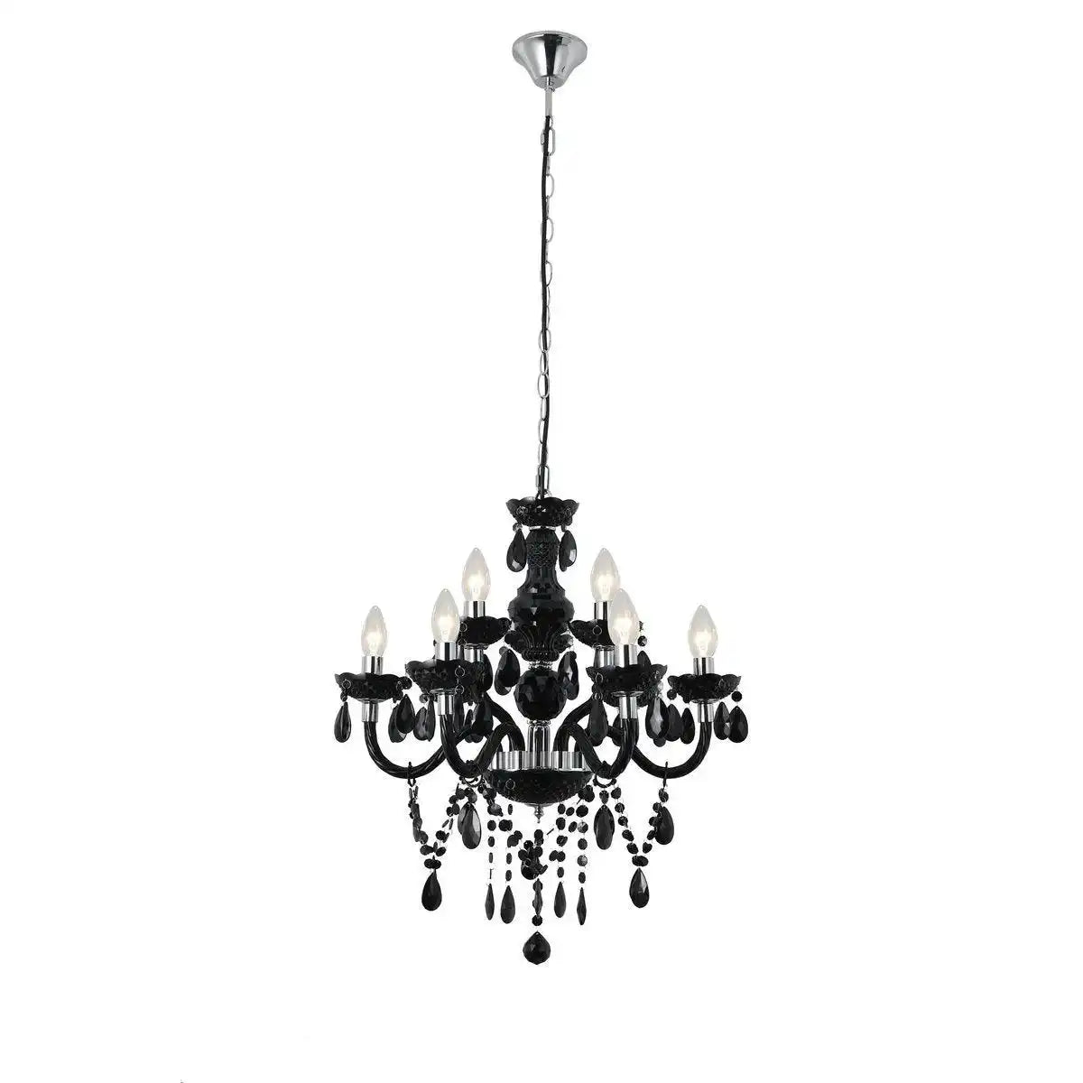 Der extravagante Kronleuchter überzeugt mit seinem modernen Design. Das gelungene Erscheinungsbild und die hochwertigen Materialien machen diese Pendelleuchte für modernes Wohnen so beliebt. Im eingeschalteten Zustand ist eine schöne Ausleuchtung garantiert, aber auch im ausgeschalteten Zustand ist diese Deckenleuchte ein besonderes Highlight. Die Metallaufhängung ist umgeben von neun Lampenbefestigungen. Der Behang ist aus schwarzem Acryl-Glas und sehr pflegeleicht. Besonders über einem Esstisch macht dieser Kronleuchter eine gute Figur, aber achten Sie darauf, dass dieser nicht zu tief hängt. Die exklusive und stylische Wirkung der Hängeleuchte ist ein eindrucksvoller Blickfang in Ihrem Wohnraum und verkörpert den modernen Stil. 9x E14, 60 W, Leuchtmittel nicht im Lieferumfang enthalten, 9 flammig, Behang aus glänzendem, schwarzem Acryl mit geschliffener Oberfläche, Aufhängung Metall (Stahl), Lampenschirm Durchmesser ca. 53 cm, kein Schalter enthalten.