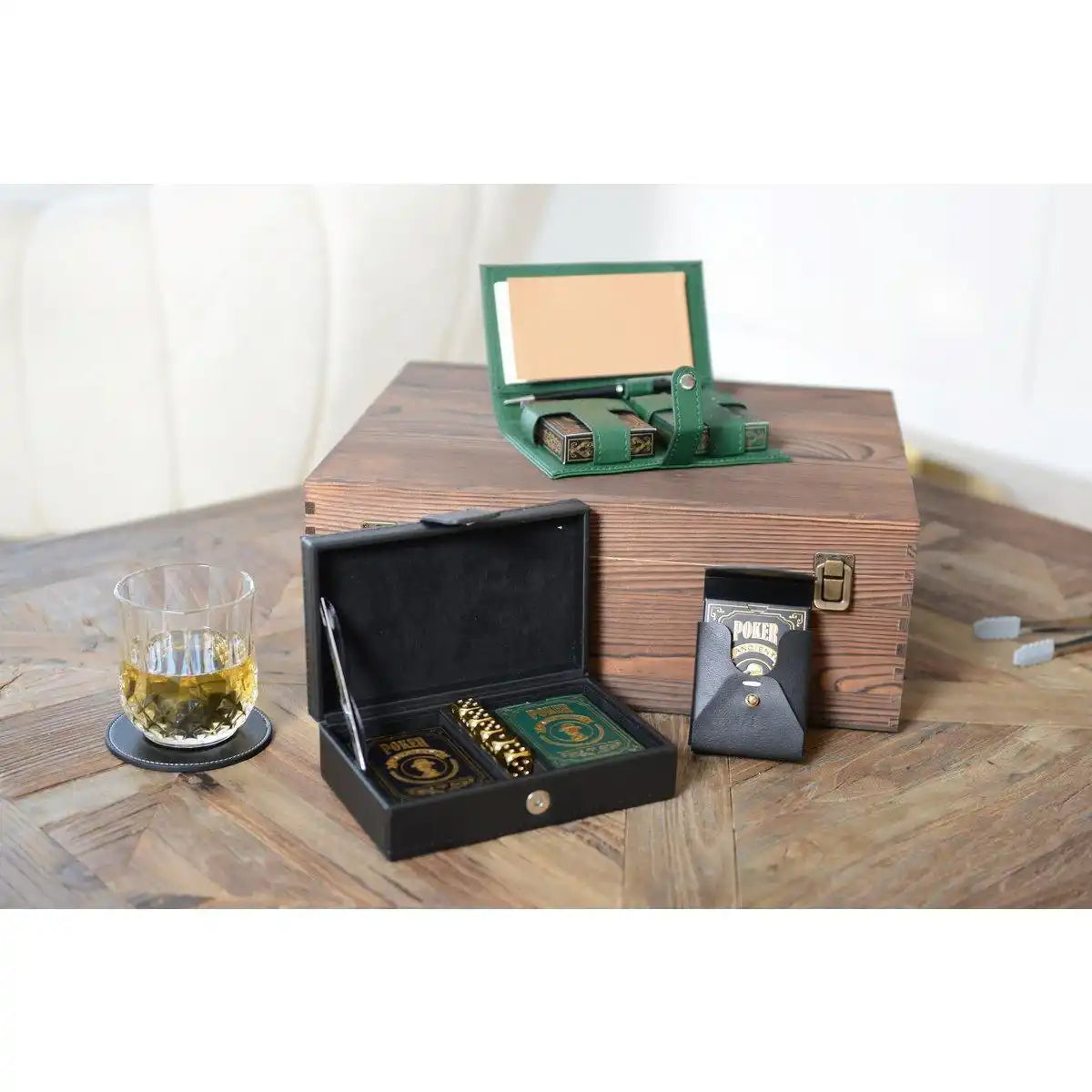 Gönnen Sie sich mit diesem üppigen Pokerspiel in einer schwarzen Ledertasche unvergessliche Pokerspiele. Dieses Set wurde entwickelt, um Luxus und Moderne zu kombinieren, und ist sowohl elegant als auch praktisch, sodass Sie Ihre Token und Karten auf präsentierte und stilvolle Weise aufbewahren können.