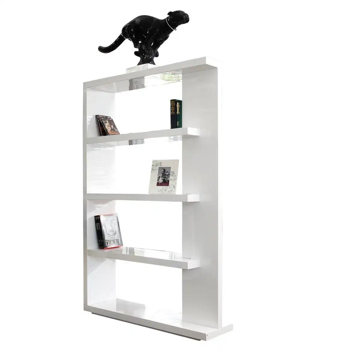 Die platzsparende Lösung für viel Stauraum. Der Raumteiler wurde aus MDF Holz gefertigt und mit einer Hochglanz weißen Schicht lackiert. Das Regal verfügt über 4 Regalböden, welche großzügigen Stauraum bieten. Sei es für Bücher, Akten oder Deko. Es können auch kleine Aufbewahrungskörbchen auf die Regalbretter gestellt werden, so sind die verstauten Dinge nicht sofort für jedermann sichtbar. Das Regal kann frei im Raum aufgestellt oder an eine Wand gestellt werden. Dank des modischen Designs passt dieser Raumtrenner in nahezu jedes Interior und findet im Wohn- oder Kinderzimmer, im Flur, im Büro oder im Schlafbereich seinen Platz. Das Standregal sieht nicht nur sehr schick aus, es erfüllt auch seinen Zweck. Höhe: 180 cm, Breite: 128 cm, Tiefe: 30 cm
