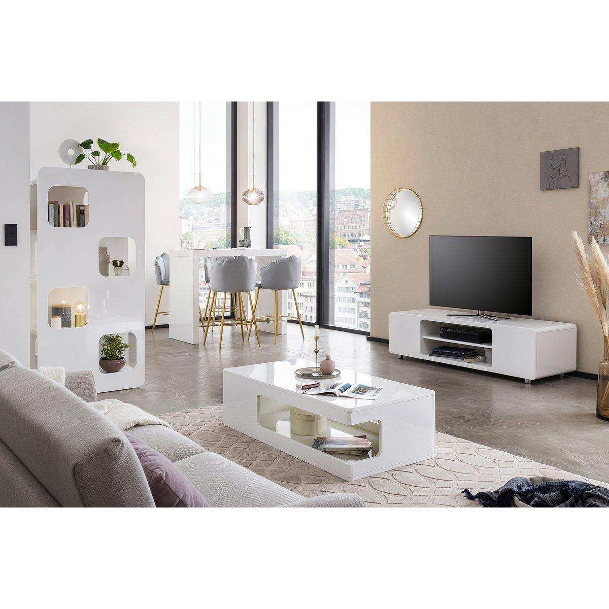 Die platzsparende Lösung für viel Stauraum. Der Raumteiler wurde aus MDF gefertigt und mit einer Hochglanz weißen Schicht lackiert. Das Regal verfügt über 4 Regalböden, welche großzügigen Stauraum bieten. Sei es für Bücher, Akten oder Deko. Es können auch kleine Aufbewahrungskörbchen auf die Regalbretter gestellt werden, so sind die verstauten Dinge nicht sofort für jedermann sichtbar. Das Regal kann frei im Raum aufgestellt oder an eine Wand gestellt werden. Dank des modischen Designs passt dieser Raumtrenner in nahezu jedes Interior und findet im Wohn- oder Kinderzimmer, im Flur, im Büro oder im Schlafbereich seinen Platz. Das Standregal sieht nicht nur sehr schick aus, es erfüllt auch seinen Zweck. 4 Regalböden, 8 offene Fächer, frei im Raum stellbar, Maße der Öffnungen: 30x30 cm, Fachmaße: B30 x T32,4 x H33,6 cm.