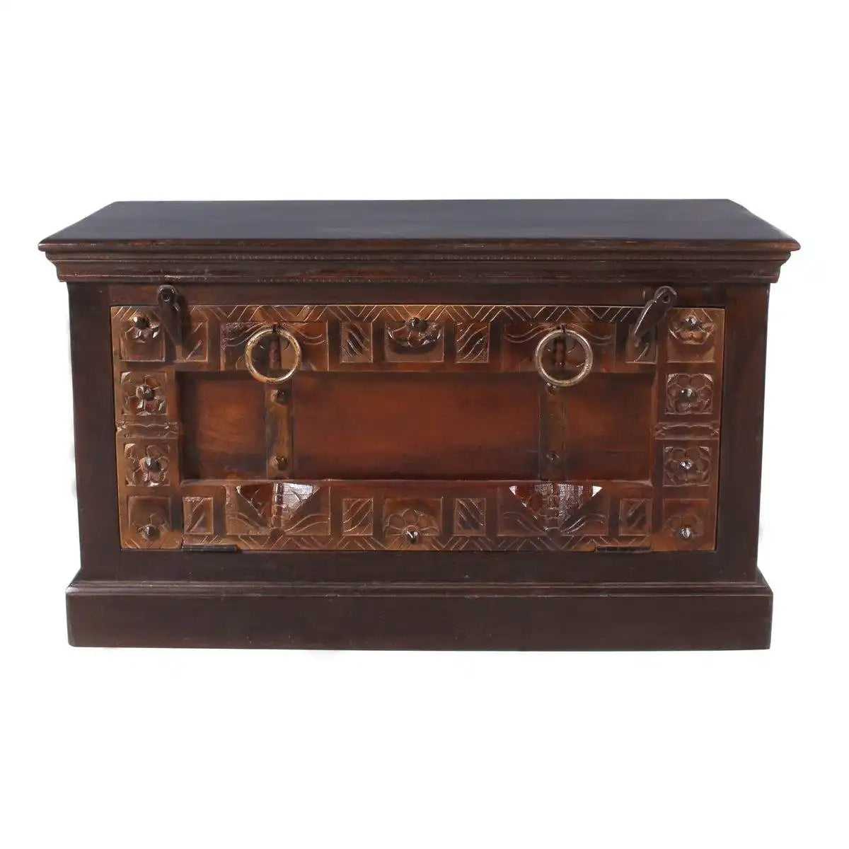 Dieser Schuhschrank, mit aufwändigen Schnitzereien auf recyceltem Altholz verziert, sorgt für Ordnung im Leben Ihrer Schuhe. Die mit 2 Ringriffen und mit Metallapplikationen versehene Klappe lässt sich auch von Kindern einfach öffnen, welche die Schuhkommode auch gerne als Sitzbank während des Anziehens der Schuhe nutzen können. Wird die Dielenkommode nicht als Sitzmöglichkeit genutzt, lässt sich die Deckplatte auch wunderbar dekorieren. Hinter der Klapptür findet sich auf 2 Ebenen genügend Raum für Sportschuhe, Sandalen, Slipper, Sneaker, Kinderschuhe usw. In jeder Diele und jedem Flur kommt der antik koloniale anmutende Charme ausdrücklich zur Geltung. Für ca. 6 Paar Schuhe, Fachmaße 72,5x14x35 cm, Einlegeboden fest.