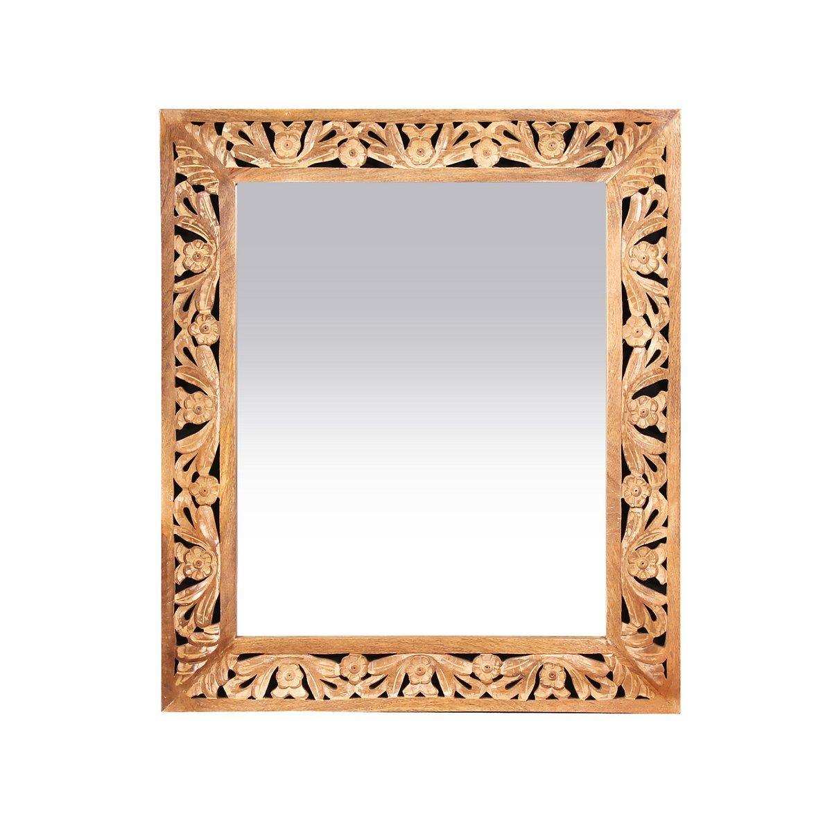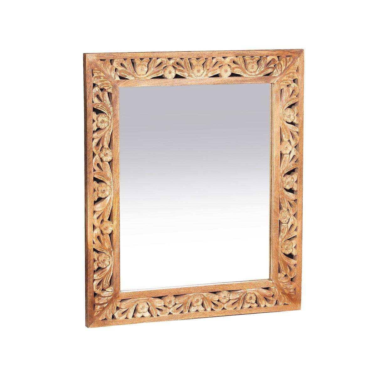 Dieser Spiegel aus Mangoholz in einem hellen Naturton wertet Ihre Räumlichkeiten auf. Er lässt sich problemlos in fast jedes Zimmer integrieren - ob Wohnzimmer, Esszimmer, Schlafzimmer, Diele oder Bad. Die aufwändigen Schnitzereien an der Front machen ihn zu einem absoluten Hingucker, um den Ihre Freunde sie beneiden werden. Jedes Teil ist ein Einzelstück von Wert.