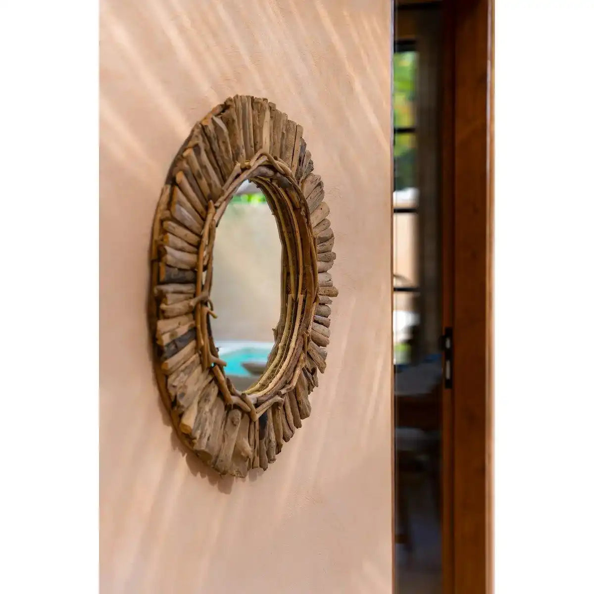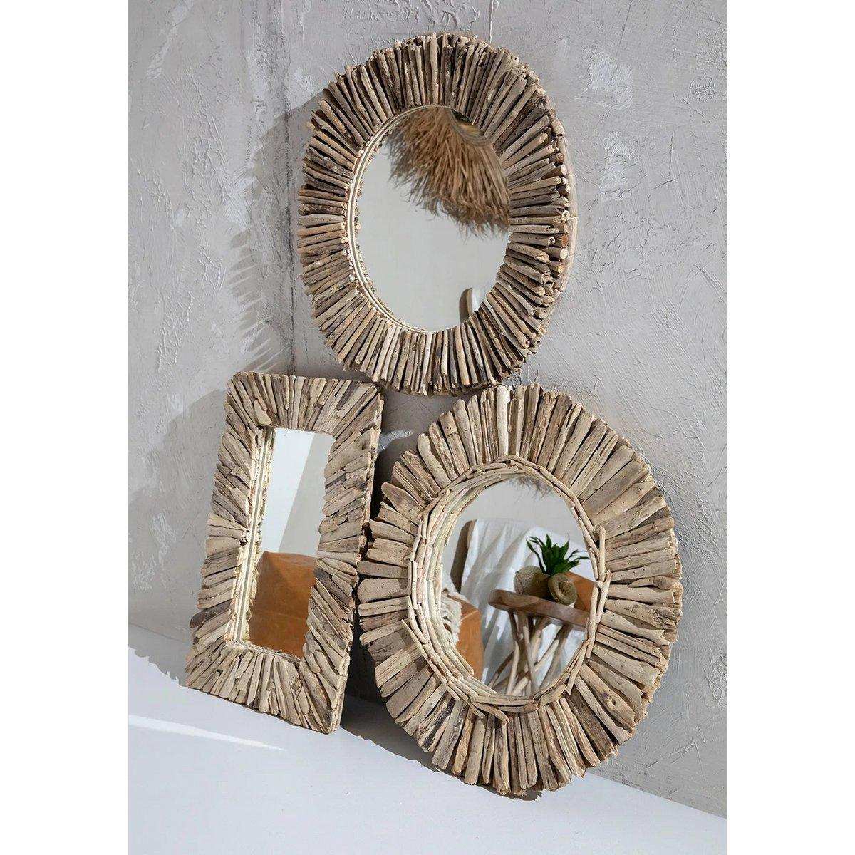 Dieser wunderschöne Spiegel entstand durch das Sammeln von Treibholzstücken und das Platzieren dieser um das runde Glas in der Mitte. Kein Spiegel ist genau gleich! Zwei weitere Designs sind erhältlich und durch die Kombination mehrerer entsteht eine atemberaubende Wand.