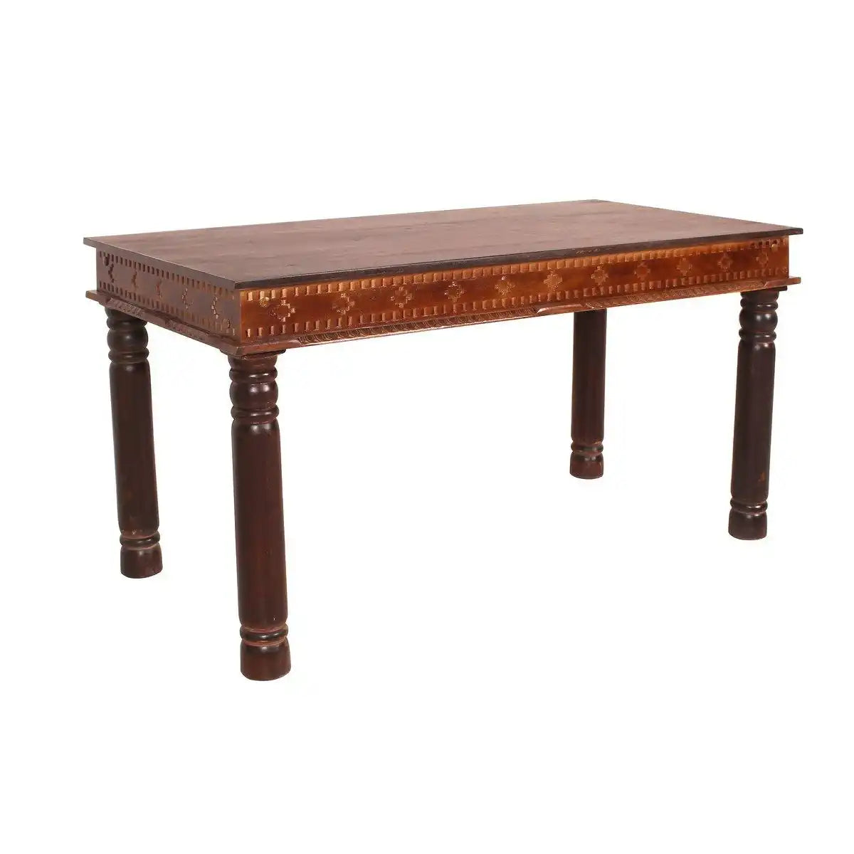 Dieser Tisch aus recyceltem Altholz besticht durch traditionelle Formen und aufwändige Schnitzereien. Der satte dunkelbraune Farbton des Altholzes passt hervorragend als Kontrast zu modernen Möbeln in zeitlosem weiß oder auch zu helleren Holztönen. Dieser Esstisch bietet genug Platz, um gemeinsam mit Freunden oder der Familie zusammenzusitzen. Ihr Essplatz wird so zum Eye-Catcher und Treffpunkt, um schöne Stunden zu verbringen. Plattenstärke 15 mm, Abstand Zarge bis Boden 66 cm.