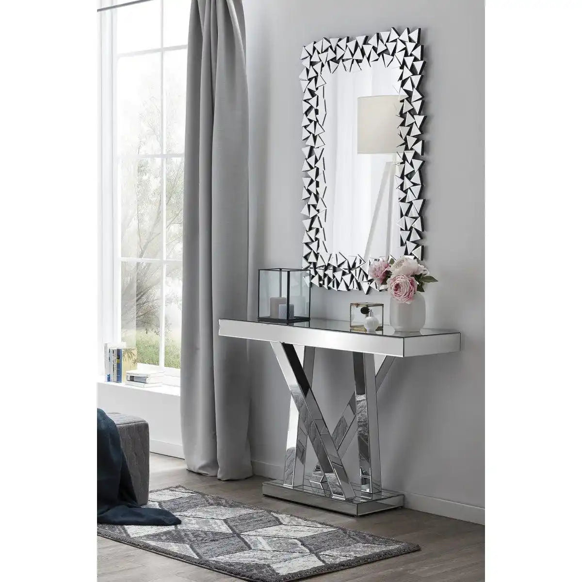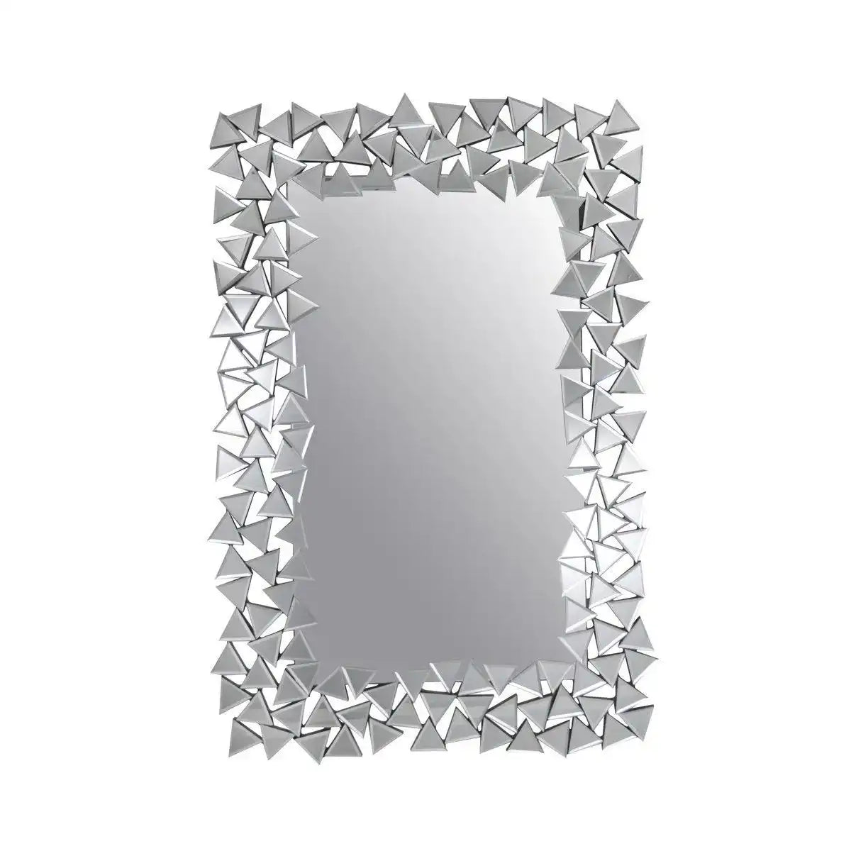 Dieser moderne Wandspiegel setzt mit seinem abstraktem Mosaikrahmen aus dreieckigen Spiegelglas Elementen dekorative Akzente in allen Räumen. Sie können den Spiegel in Ihrem Zuhause beliebig aufhängen. Sei es im Eingangsbereich, im Badezimmer, im Schlaf- oder Wohnzimmer oder sogar über einem Schminktisch. Egal, wo dieser Wandspiegel platziert wird, er ist ein echter Blickfang in jedem Wohnraum. Kleinere Verschmutzungen können mit einem leicht feuchten Tuch, ggf. auch Glasreiniger entfernt werden. Aus MDF und Spiegelglas, abstrakter Mosaikrahmen aus dreieckigen Spiegelglaselementen.