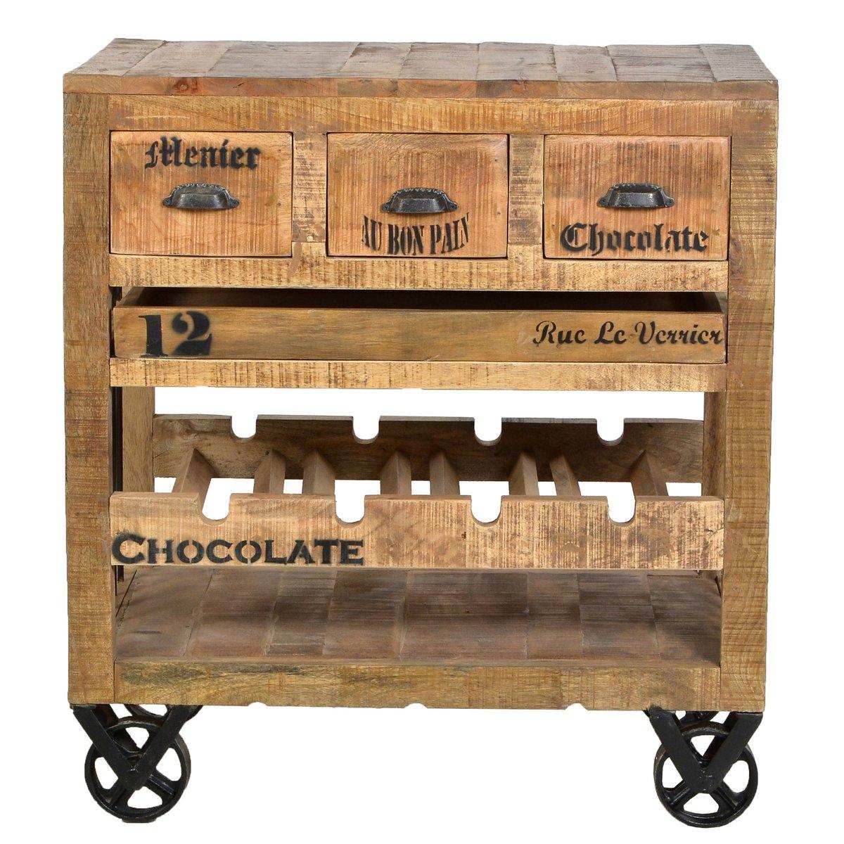 Die Kombination aus recyceltem Mangoholz und Metallbeschlägen in Antikschwarz verleihen der Wein-Kommode ihren rustikalen Charme. Das verwendete Holz stammt von alten Scheunen, Häusern und Reiströgen und ist besonders stark und widerstandsfähig. Durch die naturgemachte Witterung entsteht ein besonders warmer Farbton, der jeden Raum im Handumdrehen gemütlich macht. Die Kommode bietet Platz für 4 Flaschen und zusätzlichen offenen und geschlossenen Stauraum in 3 Schubladen und einem offenen Fach. Ein herausnehmbares Tablett macht die Kommode zu der idealen Lösung für gesellige Abende. So können Flaschen und Gläser problemlos transportiert werden. Abgerundet wird der industrielle Look durch schwarze Aufdrucke, die an Transport- und Lagerkisten erinnern. Durch die Rollen steht die Kommode leicht erhöht, was für einen luftig-leichten Look sorgt. Abstand vom Boden bis Unterkante ca. 16 cm.